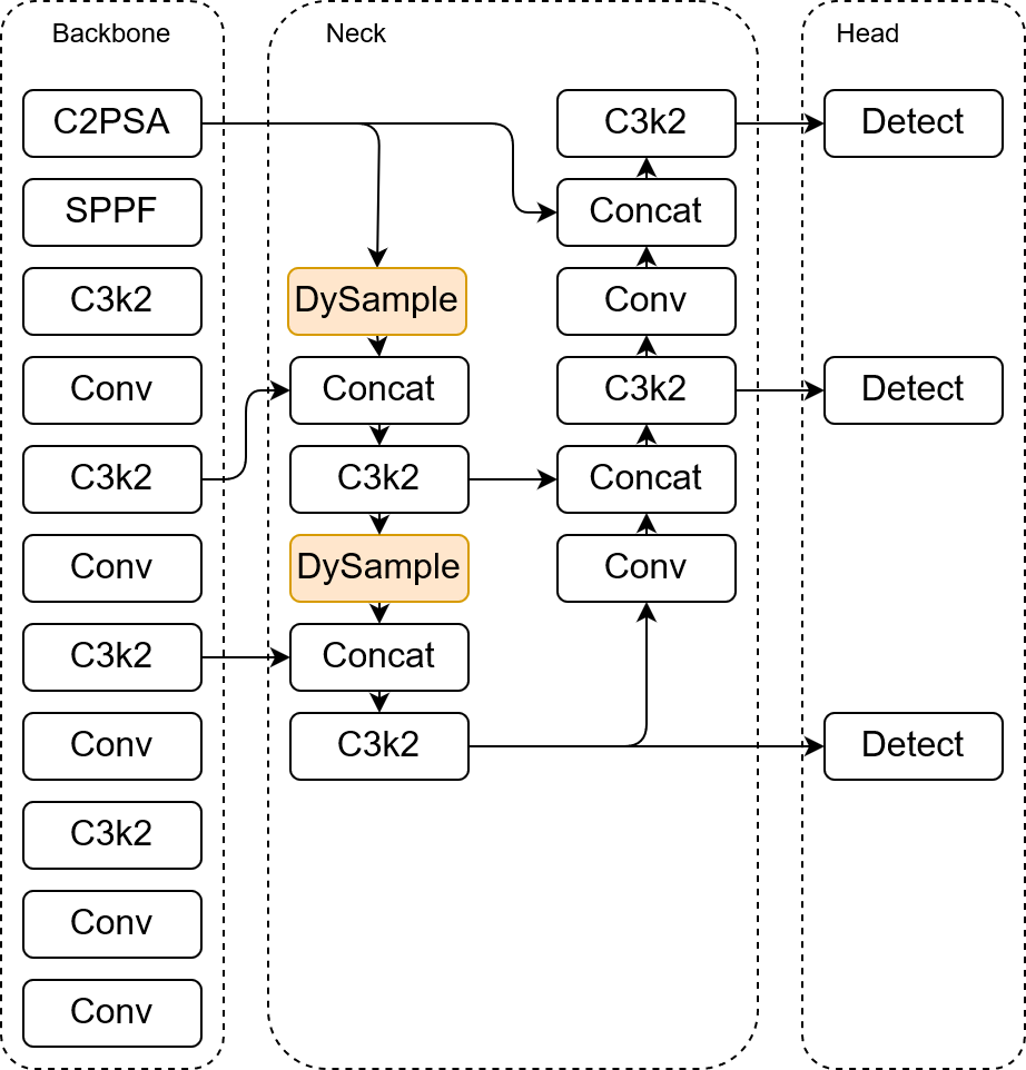 Wind turbine blades are continuously exposed to environmental factors such as wind-blown sand, humidity, heat, and ultraviolet radiation. As service time increases, surface defects—including cracks, stains, and material peeling—gradually emerge. If not detected at an early stage, these defects may worsen over time and compromise the safety and operational stability of the turbine. In current operation and maintenance practices, blade inspection still relies heavily on manual methods, which not only suffer from limited efficiency but also involve risks associated with high-altitude work. Moreover, inspection results are often influenced by the experience of individual inspectors. In response to these practical challenges, this study focuses on the identification of surface defects on wind turbine blades and introduces targeted improvements within a deep learning–based detection framework. A single-stage object detection approach is adopted for model construction, with two key enhancements. First, a DySample dynamic upsampling module is incorporated into the feature fusion process to improve information transfer across features of different scales. Second, the FocalUIoU loss function is introduced in the bounding box regression stage to enhance the model's localization capability for small-scale defects and to improve optimization during training. Experimental results show that the improved model achieves a Precision of 0.874, a Recall of 0.793, and mAP@50 and mAP@50–95 of 0.856 and 0.544, respectively, on the test set. Compared with the baseline YOLO11 model, Recall is increased by approximately 15.6%, while mAP@50 and mAP@50–95 are improved by 6.5% and 7.9%, respectively. The model contains only 2.60 million parameters, indicating minimal change in overall scale while retaining the characteristics of a lightweight architecture. Under the premise of acceptable detection efficiency, the proposed method improves the recognition performance for multiple categories of blade defects and provides technical support for wind power equipment inspection and subsequent maintenance.