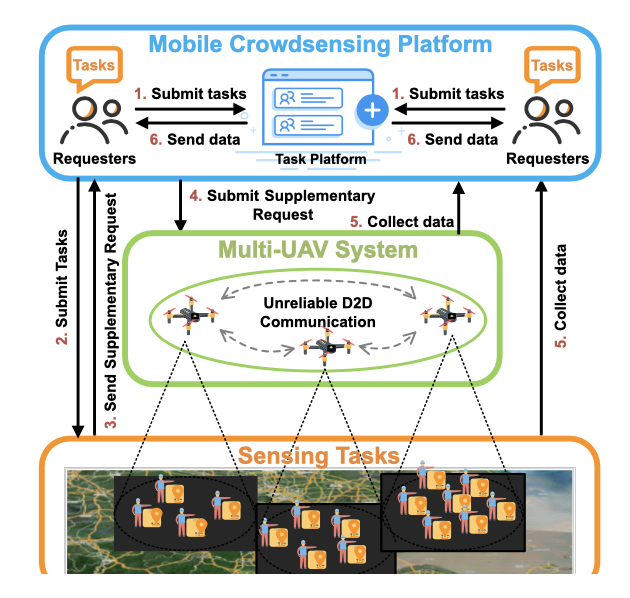 In UAV-assisted Mobile Crowd Sensing, ground workers are responsible for basic data collection, while UAVs can perform supplementary sensing in areas that are difficult to cover in a timely manner. To address the limited efficiency of distributed multi-UAV cooperative supplementary sensing in the absence of a central controller, this paper proposes an information-exchange-based distributed multi-UAV cooperative sensing algorithm, termed IE-DDQN. The proposed method formulates the problem as a decentralized partially observable Markov decision process, enables inter-UAV information exchange through short-range Device-to-Device (D2D) links, and employs a neighbor information pooling module to aggregate multi-source high-dimensional messages into low-dimensional representations, which are then combined with local observations for decision making. Experimental results demonstrate that the proposed method outperforms pure-worker and pure-UAV schemes in terms of weighted data value per unit composite cost, task completion rate, and task completion time.