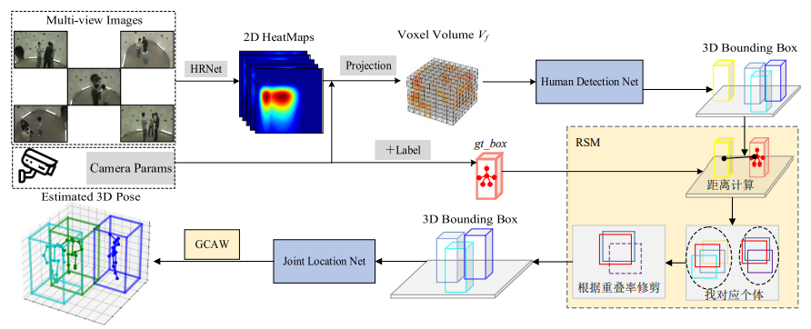In the field of computer vision, the existing real-time multi-view 3D human pose estimation method Faster VoxelPose suffers from redundant detections and fixed plane-fusion weights in densely occluded scenarios. To address these issues, this study proposes an improved method based on geometric constraints, termed FVP-GC. During the human detection stage, a Redundancy Suppression Mechanism (RSM) is introduced. This mechanism applies geometric constraint filtering to predicted bounding boxes during training using dual thresholds of distance and overlap ratio, thereby reducing redundant detections caused by projection overlaps. During the keypoint localization stage, a Geometric Consistency Adaptive Weighting (GCAW) strategy is proposed. By evaluating the geometric consistency among orthogonal planes, the method dynamically adjusts fusion weights, improving the fusion quality of multi-plane predictions. Experimental results on the Shelf and CMU Panoptic datasets demonstrate that, while maintaining real-time inference speed, the proposed method improves pose estimation accuracy compared with Faster VoxelPose, achieving average PCP3D values of 97.7% and 97.1%, and reducing MPJPE to 17.45 mm.